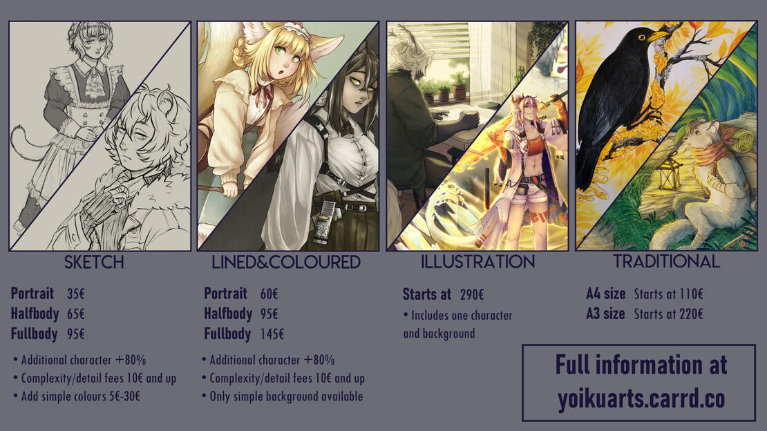 • In the case of traditional art commissions, please keep in mind that mailing the physical piece to you may be quite expensive depending on your location. (A3 sized painting mailed outside of Europe for an example, costs about 42€) So make sure you have some room in your budget for the shipping costs!